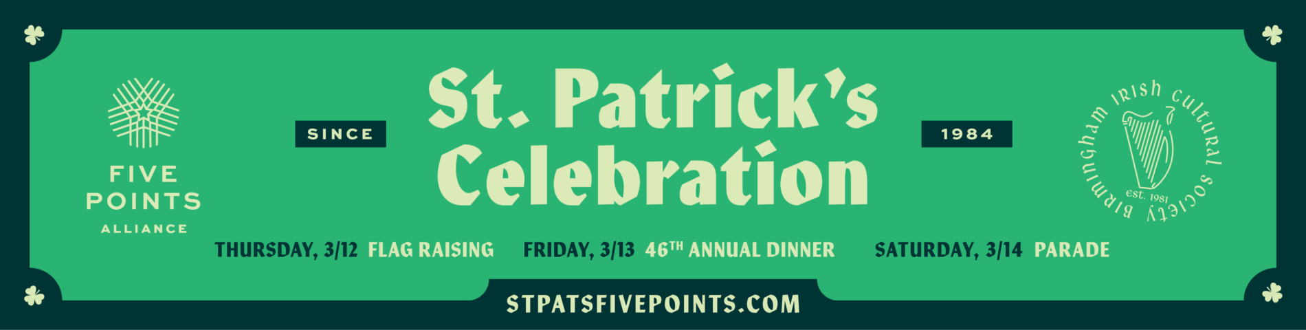 Kick off the Five Points South St. Patrick’s Celebration at the 12th Annual Irish Flag Raising! Join us at 5:00 p.m. at the flagpole in front of Chick-fil-A in Five Points for a festive ceremony led by the Birmingham Irish Cultural Society. This event is an opportunity to get the holiday fun started early and set the tone for the festivities ahead.