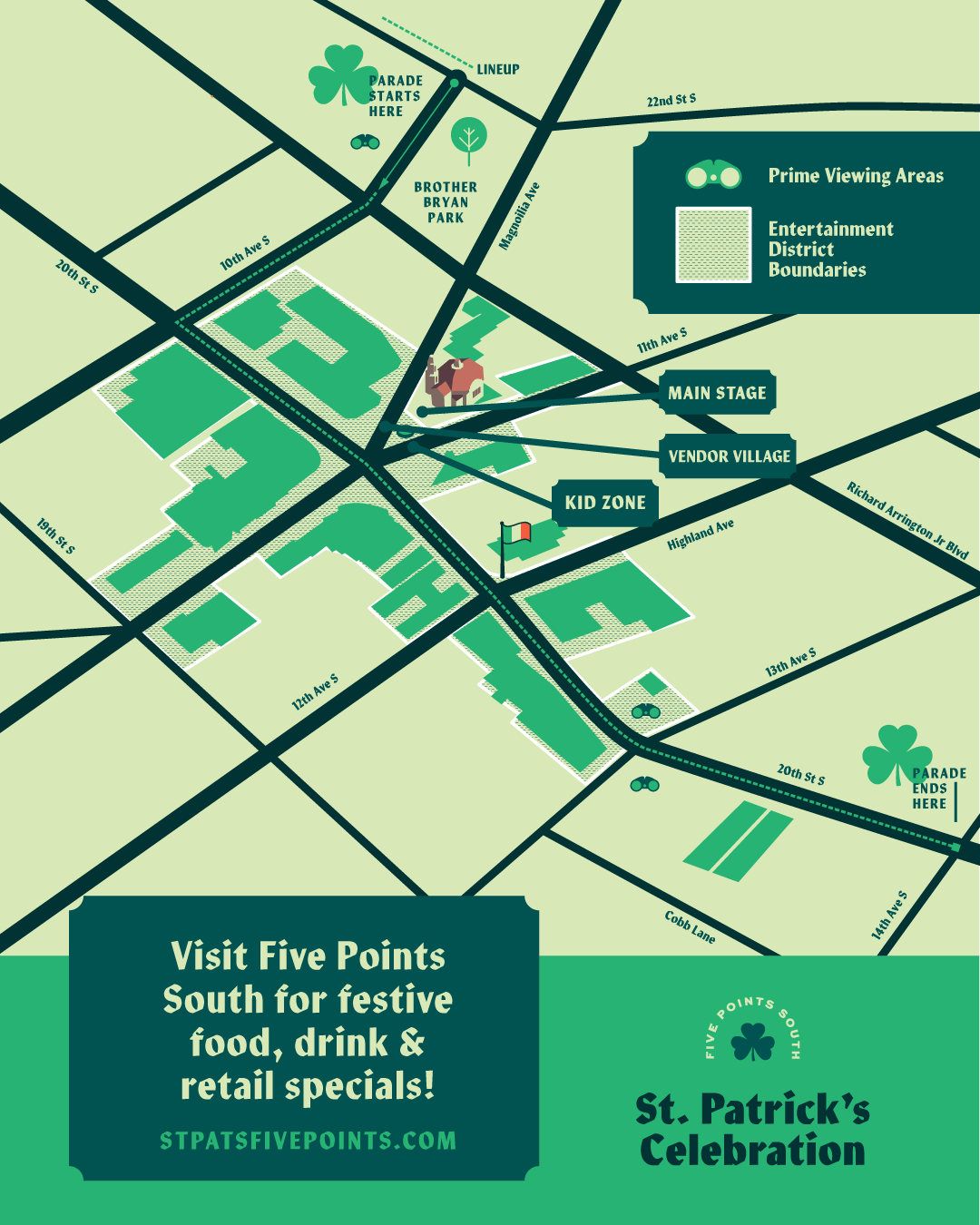 Put on your green and feel the luck of the Irish at the 42nd Annual St. Patrick’s Day Parade in Five Points South on Saturday, March 14! The parade will kick off at 1:30 p.m. on 10th Ave. S., winding aside Brother Bryan Park and up 20th Street South, led by the lively Ian Sturrock Memorial Pipe Band and other local groups. Don’t miss the shenanigans!
